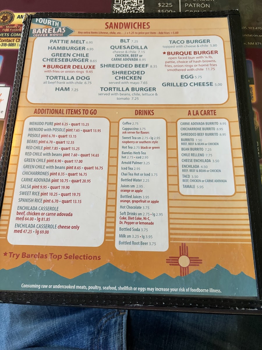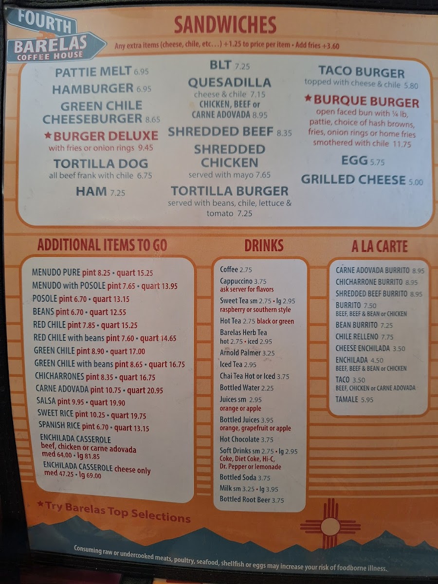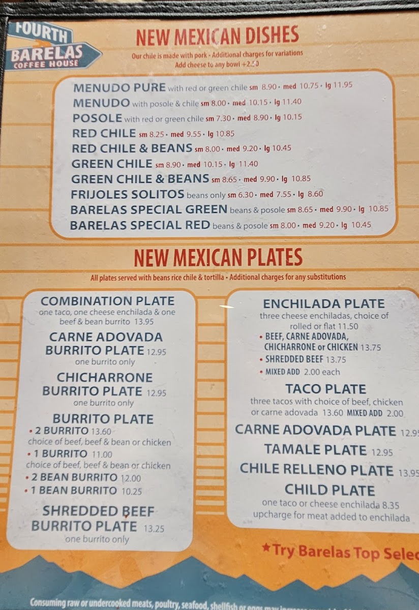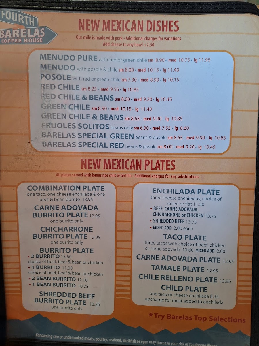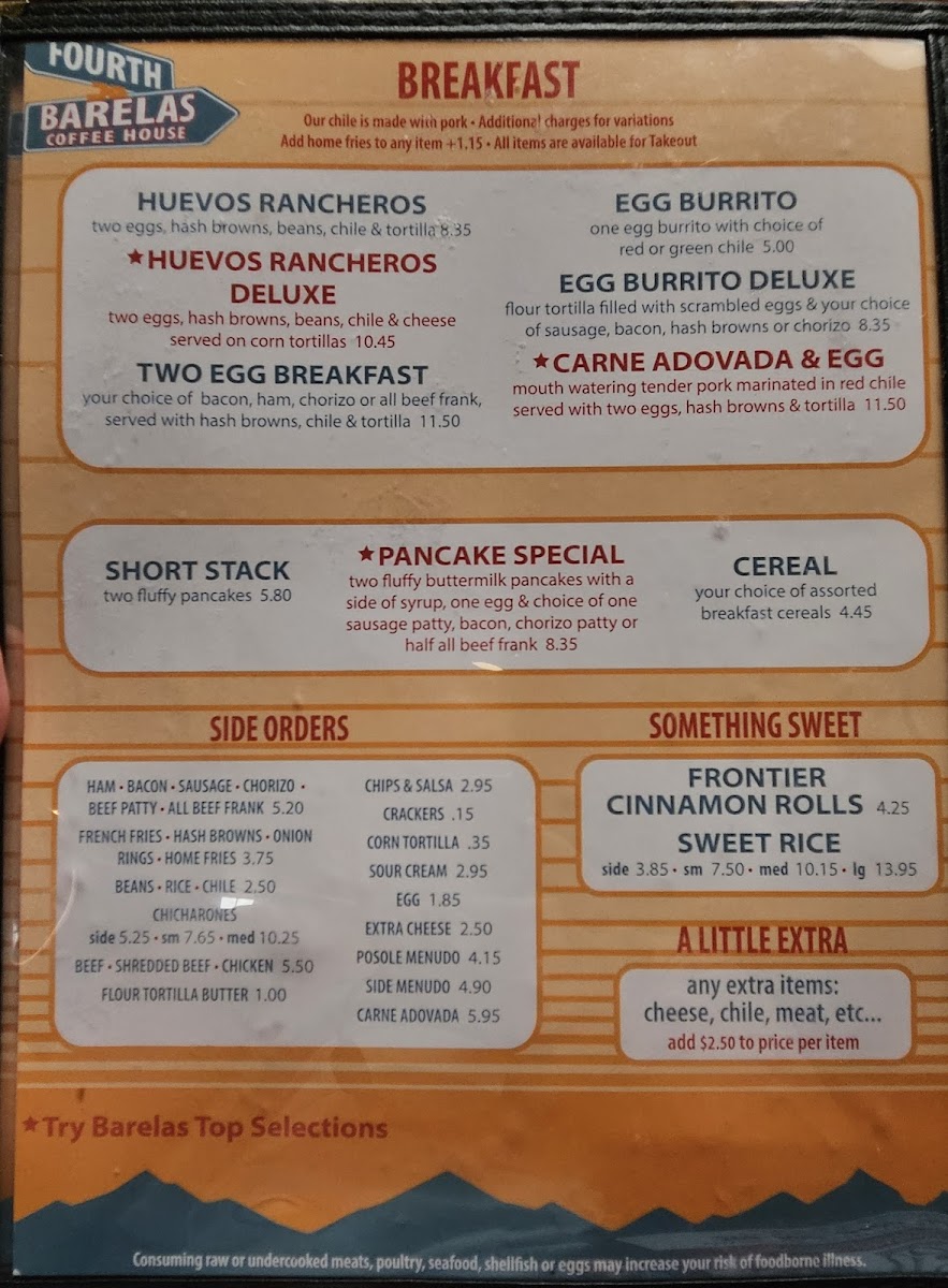 This menu offers a variety of traditional New Mexican dishes with a focus on breakfast and casual meal options. It is structured to provide a range of hearty entrees, side orders, and beverages suitable for different times of the day, particularly breakfast and brunch.