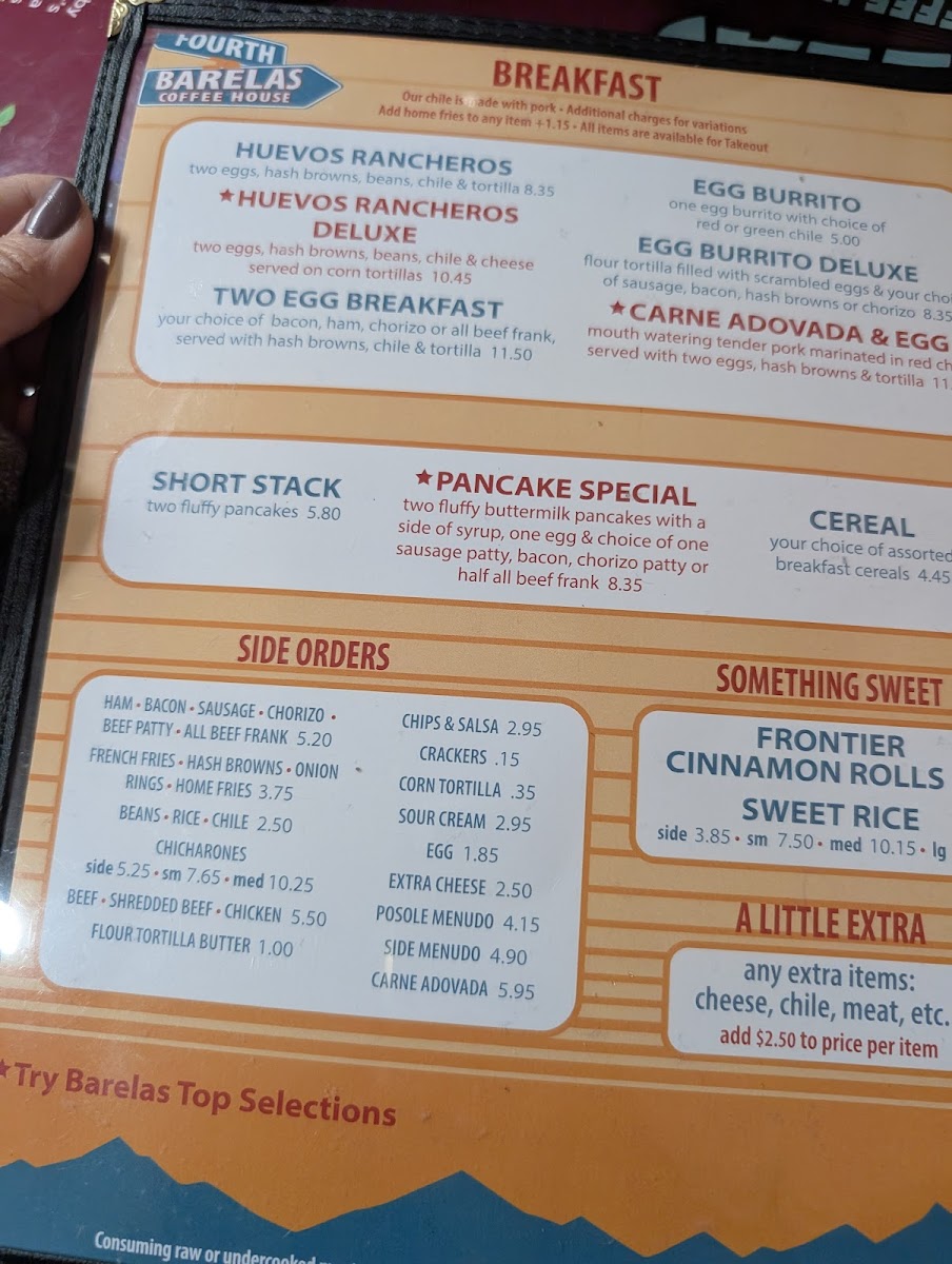 - Breakfast Entrees: Including classic items such as Huevos Rancheros, Egg Burritos (both basic and deluxe versions), and plates featuring Carne Adovada with eggs and hash browns. These offerings often incorporate local staples like beans, chile, and tortillas.